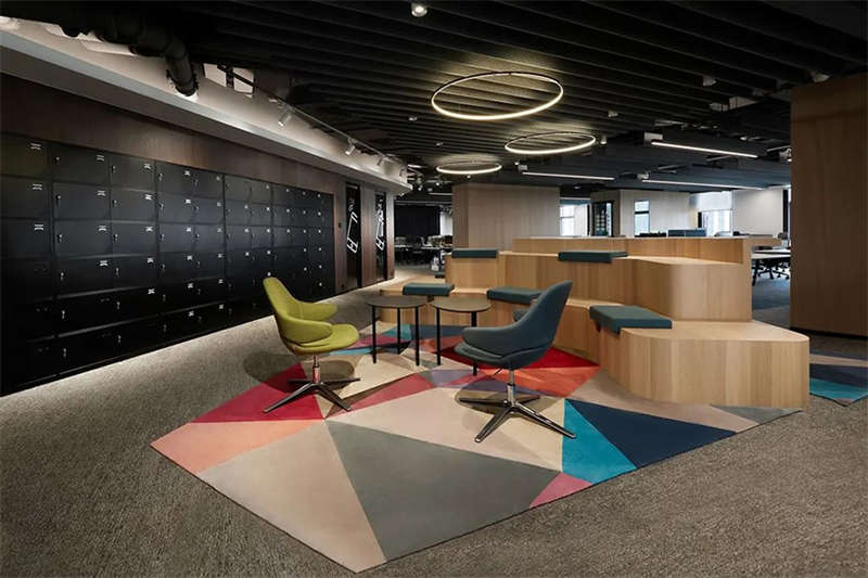 材料運用上,采用一系列天然、可再生和低排放的節能措施和材料,讓員工感受到與自然的聯系,同時提供了室內聲學舒適度。還采用了公司貿易產品——玻璃,各種玻璃的運用,充分體現了企業性質及對玻璃加工工藝的理解,既作為裝飾材料,也讓辦公區各個區域都成了產品展示區,電梯廳和門廳運用了黑色背烤漆蒙砂玻璃,電梯廳頂部運用黑色銀鏡腐蝕雕刻形成總部辦公地所在的區域地圖,其他區域也充分將壓花玻璃、幕墻玻璃、淋浴隔斷玻璃及辦公高隔玻璃等進行了充分展示。