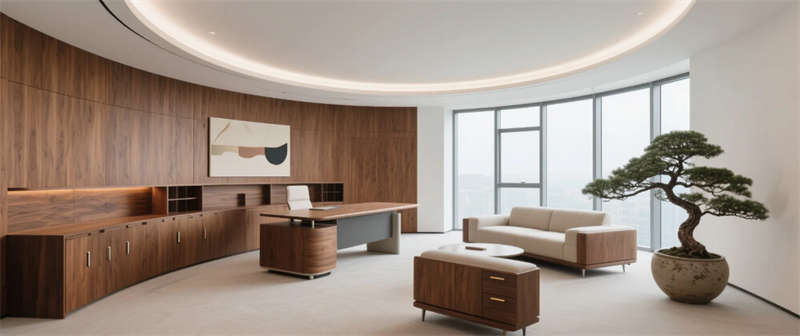 以低飽和度色系為視覺基底,現代極簡主義與自然生態理念在此交融,構建兼具理性效率與情感溫度的辦公場域。通透的玻璃幕墻將城市天際線引入室內,前廳接待區以深褐大理石與抽象金屬裝置傳遞企業質感,垂直綠植墻模糊建筑與自然的邊界。開放式辦公區以模塊化家具與弧形書架創造靈活動線,透明天窗將日光轉化為流動的創作能量,幾何聲學板在靜謐中守護協作靈感。