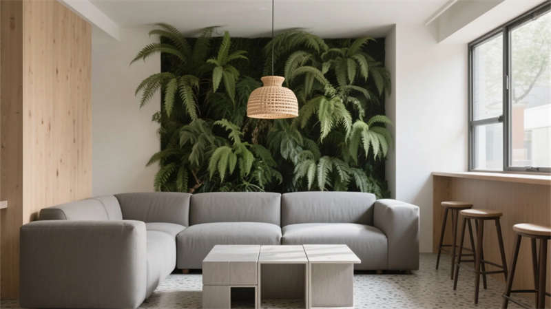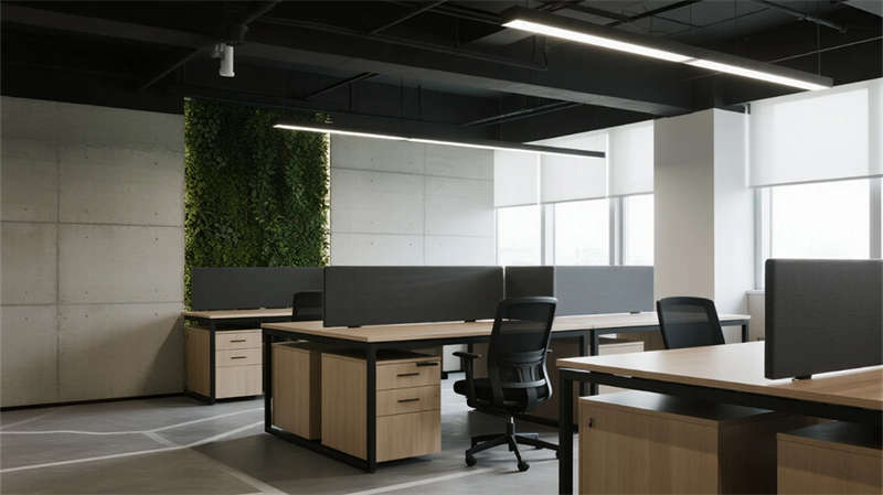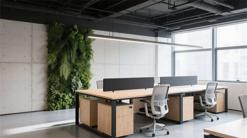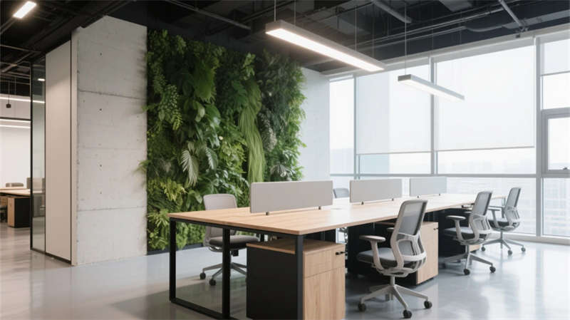 該空間以"自然共生"為脈絡(luò),將輕工業(yè)基因與生態(tài)美學(xué)深度融合。裸露結(jié)構(gòu)的天花與溫潤木元素形成張力,貫穿各區(qū)域的垂直綠植墻如同呼吸脈絡(luò),賦予嚴(yán)謹(jǐn)辦公場(chǎng)景盎然生機(jī)。