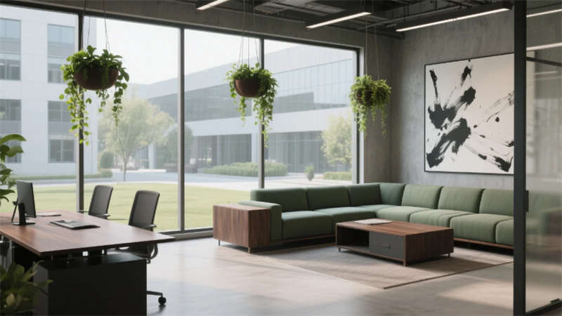 該辦公空間以"自然共生"為核心理念,將科技感與人文溫度融入兩千平米的開放場域。流動的淺木色調貫穿始終,啞光金屬與微水泥形成質感對話,模塊化家具構建靈活場景。綠植生態系統從空中吊籃蔓延至苔蘚墻面,模糊室內外界限。