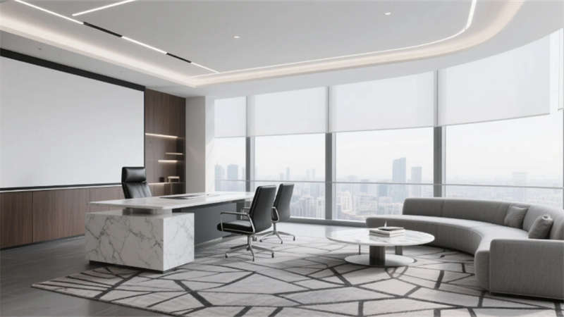 全案貫穿啞光金屬、木飾面與大理石材質細節(jié),4000K中性光統(tǒng)一色溫,智能燈光系統(tǒng)提升能效。設計通過嚴謹?shù)木€條分割與人性化功能分區(qū),實現(xiàn)美學與實用性的深度融合,重新定義現(xiàn)代辦公空間的品質標準。