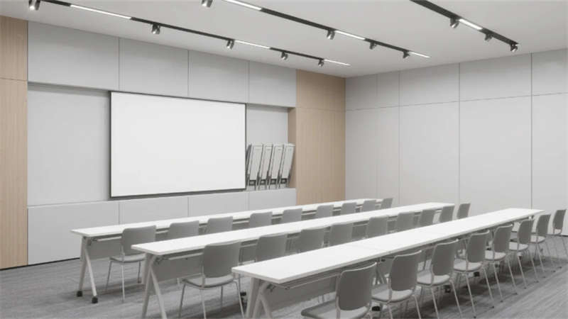 高管辦公空間彰顯差異化設計:經(jīng)理辦公室以木格柵墻面與模塊沙發(fā)營造親和力,總裁辦公室則通過深胡桃木隱形門、弧形沙發(fā)與城市景觀落地窗凸顯沉穩(wěn)氣度。多功能廳采用可伸縮隔斷與嵌入式LED屏,適應培訓、會議等多場景需求;茶水間以中島吧臺與幾何層板打造輕松社交空間,筒燈聚焦的綠植墻增添生機。