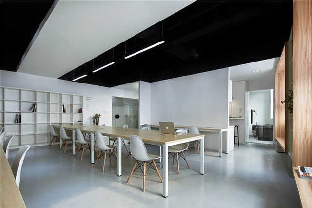 在78平空間內布置20個工位、茶水間、會議室和一個獨立辦公室并不容易,設計師在平面功能最大化,營造豐富的灰空間,消除辦公空間以往嚴肅緊張的固有印象。黑白極簡的設計語言在節省造價的同時完美契合了IT公司的現代感與科技感,而木質的飄窗是整個黑白空間的一抹暖色,在有限的面積中為員工營造了輕松的閱讀與交流空間。豐富的玻璃隔斷形成通透的空間,相互貫穿,模糊了空間屬性,從而削弱小空間帶來的局促感。