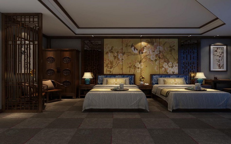 中式賓館標(biāo)間設(shè)計(jì),用自然花木的靈性之美裝點(diǎn)空間,燈影流連處,一室清雅,身心皆醉.通過采用中式風(fēng)格博古架、隔斷、掛落等裝飾,互通借景,虛實(shí)相生,于"圍而不隔,隔而不斷"之間,構(gòu)成層次豐富、境界幽深、情趣無窮的中式家具體驗(yàn)之境.
