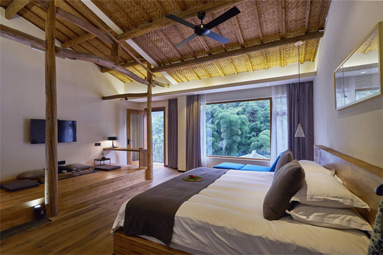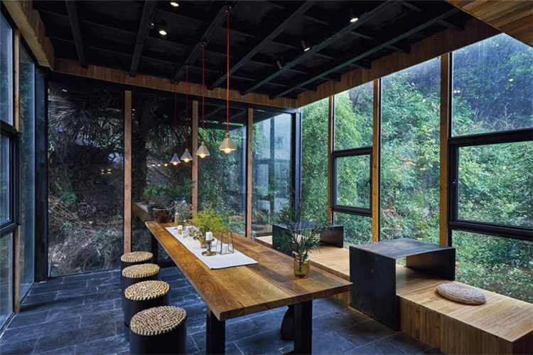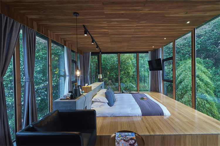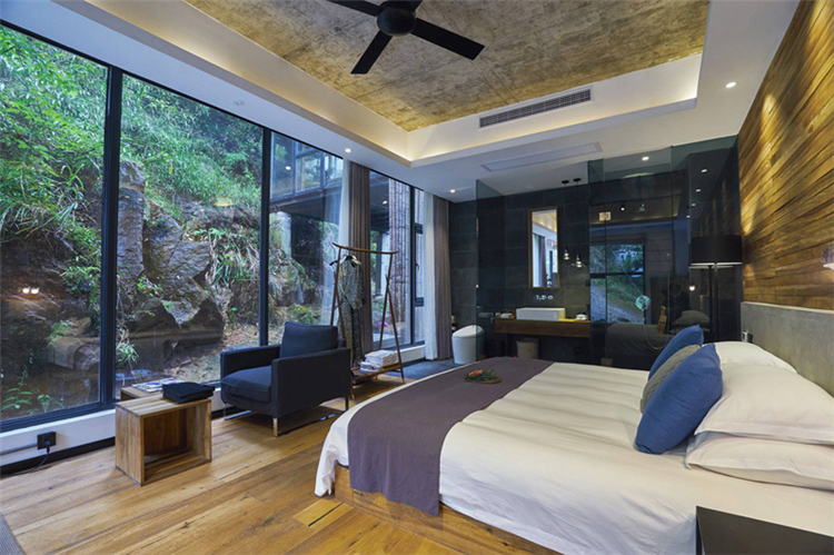 玻璃為墻、為窗,鋼結(jié)構(gòu)吊頂,木色為板,與周圍環(huán)境相得益彰,仿佛置身山間之色;睡醒的清晨,清新的空氣迎面而來,拂去懶懶睡意;用山間的寧靜,洗去旅途疲勞,或者城市的浮華與躁動(dòng),體味另一番人生心境。