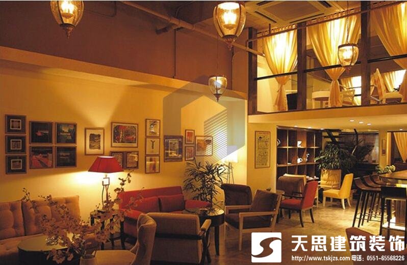 咖啡館的頂面處理就要根據(jù)總體空間安排是否吊頂。如果吊頂?shù)脑?,一般采用石膏板再以乳膠漆飾面,頂上的乳膠漆盡量用純白色的,便于把進(jìn)入房間的光線很好地反射下來。