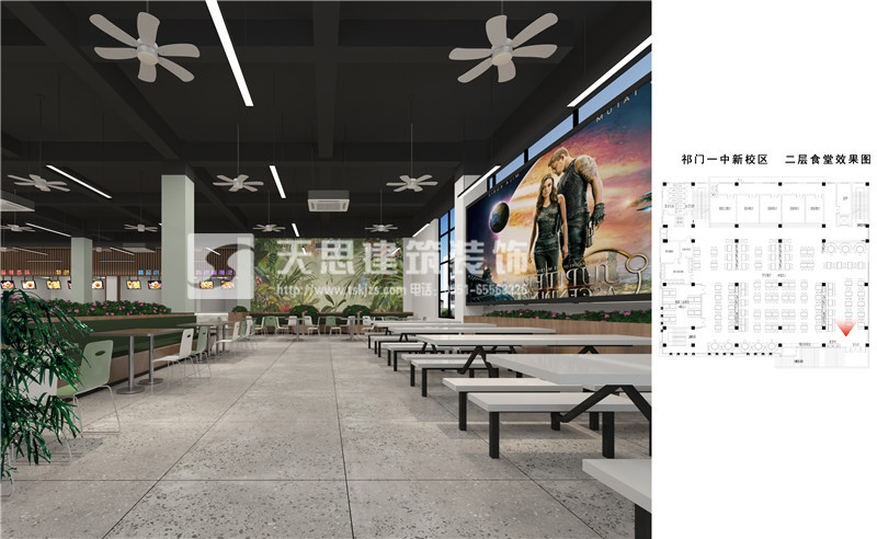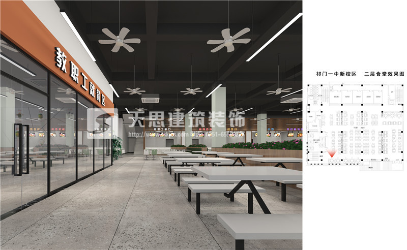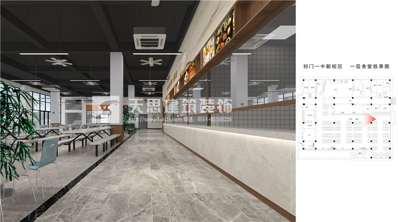 安徽天思專業專業提供餐廳設計,食堂裝修施工服務,質量有保障。以下為祁門一中食堂設計效果圖,請您欣賞。如果您有相關需求請及時與我們聯系。