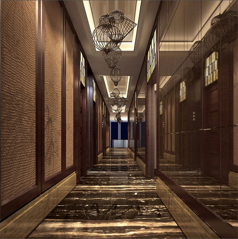 客房走廊通道建議選擇一些柔軟的材料,如果使用瓷磚這種硬質的材料作為鋪裝的話,只會讓人覺得冰冷。管道井里門應采用防火門,外門裝修成可活動的壁嵌式,頂部設置筒燈,將管道井門裝飾成與走廊墻面渾然一體裝飾品。