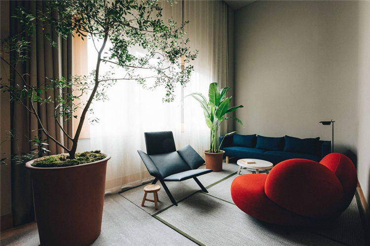 酒店的客房同樣色彩斑斕。客房的開放空間中央立有大型紗柱,懸掛著自然染色的靛藍色漸變織物??头靠崭唛_闊,四周擺設有CKR設計的沙發,皮革躺椅及一系列盆栽裝飾。同時,房間內配有唱片機及精選的黑膠唱片,為房間帶來了親切感。房間內的照明采用特別設計的燈具,其中以定制的紙質燈最具特色。此外酒店客房,套房及復式套房中,都采用了紡織品裝飾的定制雙人沙發。