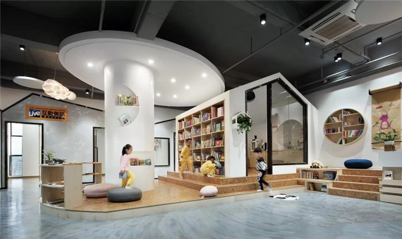 為了保持空間的調配度,不做過多裝飾;色彩把控上,選擇自然親和的白、灰、木色調,孩子們是唯一的濃墨重彩,繪本則是星星點點的輔助色。用“書吧”的概念打造大廳,弧形書架、圓形吊頂與地面抬升的設計,讓繪本閱讀成為體量內的重心。