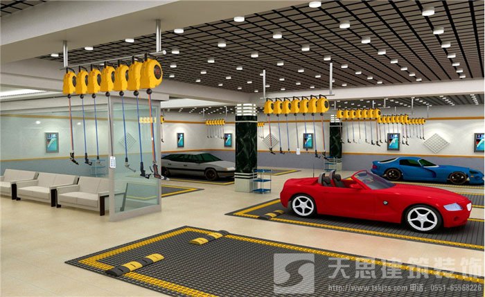 汽車(chē)美容工位是汽車(chē)美容店的客戶(hù)車(chē)輛進(jìn)行施工的場(chǎng)所,因此在這里裝修要盡量考慮水電氣股的吊放,可以?xún)蓚€(gè)車(chē)位公用一個(gè)水電氣股,節(jié)省成本。