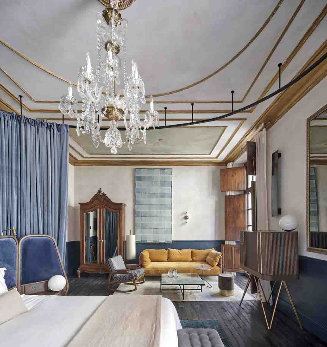 設(shè)計(jì)師旨在喚起比酒店更多的參觀房屋的經(jīng)歷。因此,客戶不是在酒店接待處而是在房子的門廳見面;找到的餐廳而不是餐廳,而是找到了居民用餐室,這些房間和客廳就像您在老房子中找到的那樣。該項(xiàng)目精心保留了建筑物中浪漫的氛圍,并與不同時(shí)期的干預(yù)和元素進(jìn)行了有意識(shí)的對(duì)比。這是對(duì)現(xiàn)有百年建筑雜交的尊重,它保留了過去的痕跡,并避免了房屋從未擁有過的輝煌過去的錯(cuò)誤恢復(fù)。