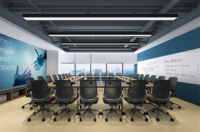 2、該辦公室裝修項目主要是使用者作為科技類產品的研發空間,要求足夠寬敞,空間的開放度與靈活度自由變換,辦公桌實現可隨意拼裝組合。設計師在設計上立足于;靈活共享的主線,以設計、現代、開放和連通為主題,著眼于科技發展的今天和未來,創造出一個極富時代感和超前性的辦公空間。整個辦公空間以白色為基底色,輔以藍色的協調、中和,黑、  白、藍成為標準層的主色系,完美將辦公層的空間格局進行分割,營造出現代簡約、自由開放的高端科技感。長方形燈具應用突出了現代科技的嚴謹態度,極大凸顯企業的文化感與產品前沿的設計感。會議室根據實際需求,實際軟裝時則以多彩元素為主題,一眼望去 ,布滿了明快的顏色 ,活潑卻不繁雜 ,采用的半透明亞克力玻璃椅是點睛之筆,帶給空間無限的靈動感。黑板漆墻面設計則豐富了使用者的功能需求,達到裝飾和功能并存的目的。靈活的辦公桌還可自由變換,滿足不同需求的會議要求。