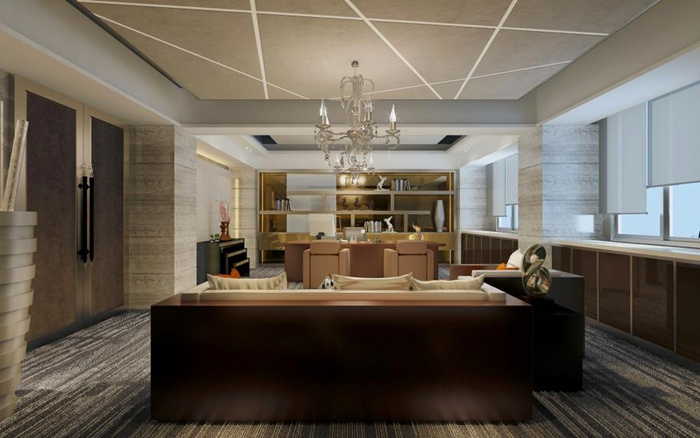 3、有質感的辦公室設計:設計師通過簡化前臺裝飾元素來凸顯簡介的企業標識,讓綠植承載的環保元素更加醒目,同時也強調了企業的科技感。在設計前方接待區的時候,充分運用了自然色+燈光的組合來強化企業內涵體驗。沙發、地毯、茶幾與落地燈在開放的空間里構建了一個心理上私密的會客區域,具有濃濃的現代科技氣息。將空間劃分為辦公區域、交流區域、展示區域,在設計師看來總經理辦公室相當于一個小型的迷你辦公室,既要具備多重功能,又要做到空間內部的辦公與配套系統的完整與契合。通過地毯、精選的辦公桌椅,并且結合不同區域燈光的變化讓辦公空間具有層次感。