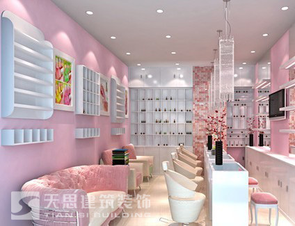 合肥裝飾公司關于美甲區的設計最好桌子上多安上燈光,多設立一些凹槽,方便指甲油的擺放。墻上也多做一些隔板,可以擺放各式各樣的美甲工具,可以達到美觀的效果,不至于顯得太過空曠。店面裝飾時設計一些相當具有親和力的裝飾品,讓人很放松卻又能不影響美甲師涂指甲油的環境色彩和照明,給人一種溫馨簡潔的設計效果。然后在墻上安上幾個大鏡子,除了能顯得空間大之外,顧客還可以隨時看到自己的妝容服飾等等。再擺上幾盆鮮花,讓顧客在享受護理的同時又能聞到花香的味道。