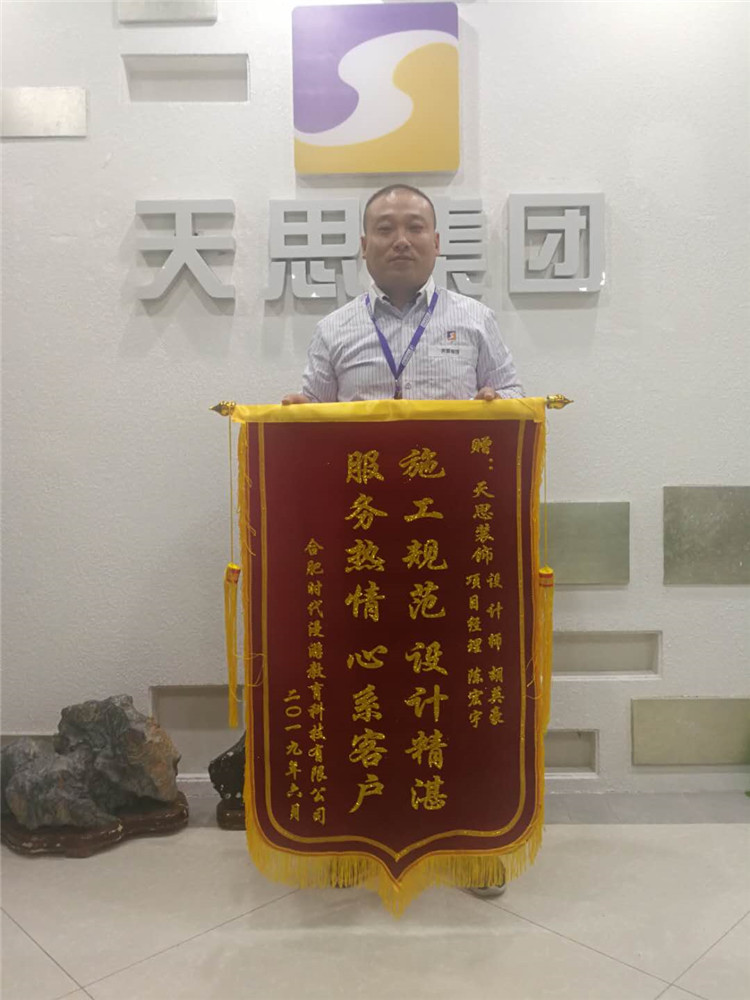 業(yè)主在百忙之中特意來天思裝飾贈送錦旗,對施工項目經(jīng)理陳工的施工質(zhì)量和服務贊不絕口.業(yè)主道:他懷著萬分感激之情,向陳工、胡工及天思裝飾全體員工表示真誠的感謝和良好的祝愿. 錦旗上寫著"施工規(guī)范 設計精湛 服務熱情 心系客戶"16個燙金大字,錦旗雖小,分量厚重.