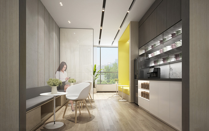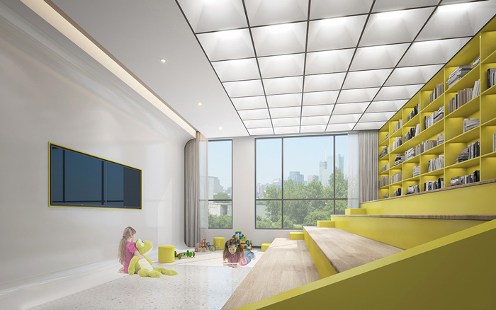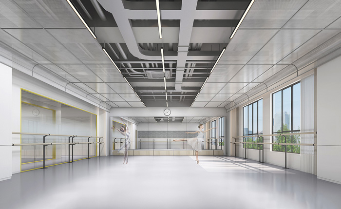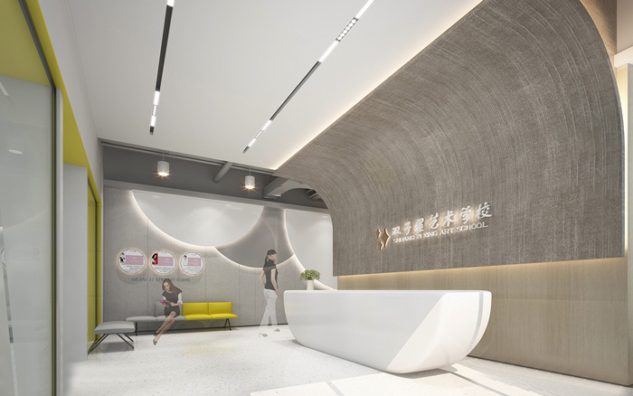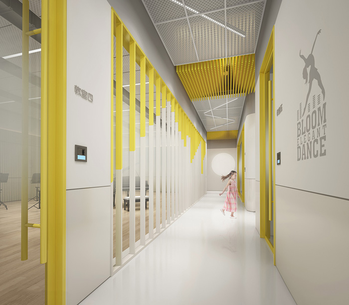 此處藝術(shù)學(xué)校設(shè)計中,告別了五彩斑斕的顏色,突出了空間的簡潔與干凈,用黃色做為點綴色提升空間的趣味性。