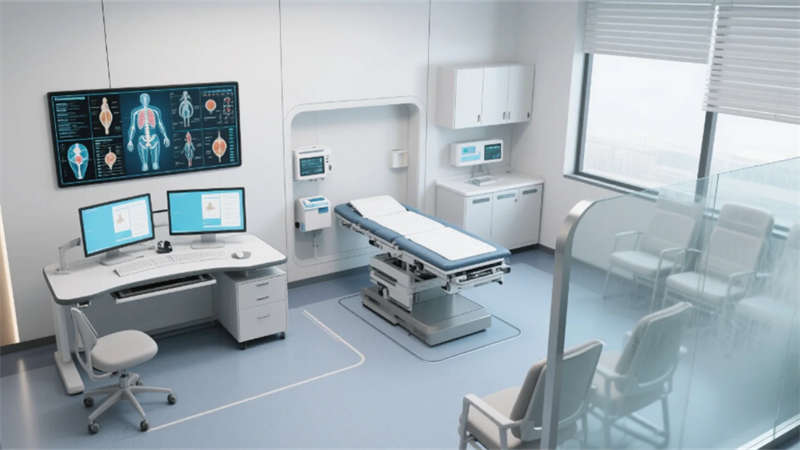 空間以低飽和度灰綠為基調(diào),原生木紋肌理與仿生曲面造型貫穿各區(qū)域,形成視覺(jué)連續(xù)性。主入口大廳通過(guò)挑空木格柵天花引入模擬天光,曲面導(dǎo)診臺(tái)整合智能導(dǎo)航系統(tǒng),落地窗外的療愈庭院模糊室內(nèi)外界限。診室采用霧化玻璃隔斷保障私密性,模塊化醫(yī)療設(shè)備帶與升降診療桌形成靈活工作界面,電子解剖圖譜墻實(shí)現(xiàn)醫(yī)患可視化溝通。